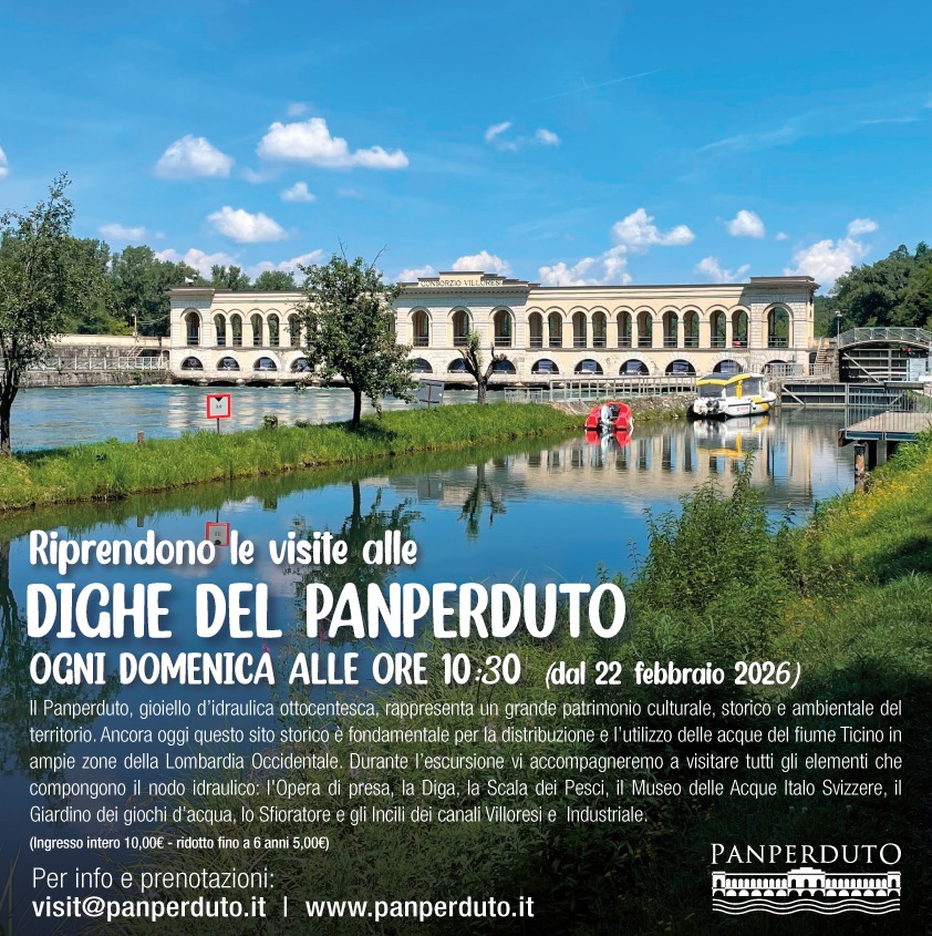 Panperduto, gioiello d’idraulica ottocentesca, rappresenta un vero e proprio patrimonio culturale, storico e ambientale, oltre alla sua centralità ai fini della distribuzione irrigua, ma non solo, delle acque del fiume Ticino. Durante le escursioni, le guide di Panperduto accompagneranno i partecipanti alla scoperta di tutti gli elementi che compongono il nodo idraulico: l’opera di presa, la diga, la scala di risalita dei pesci, il Museo delle Acque Italo-Svizzere, il Giardino dei giochi d’acqua, lo sfioratore e gli incili dei Canali Villoresi e Industriale. Dal prossimo 22 febbraio, ogni domenica a partire dalle ore 10.30. Per info e prenotazioni: visit@panperduto.it.